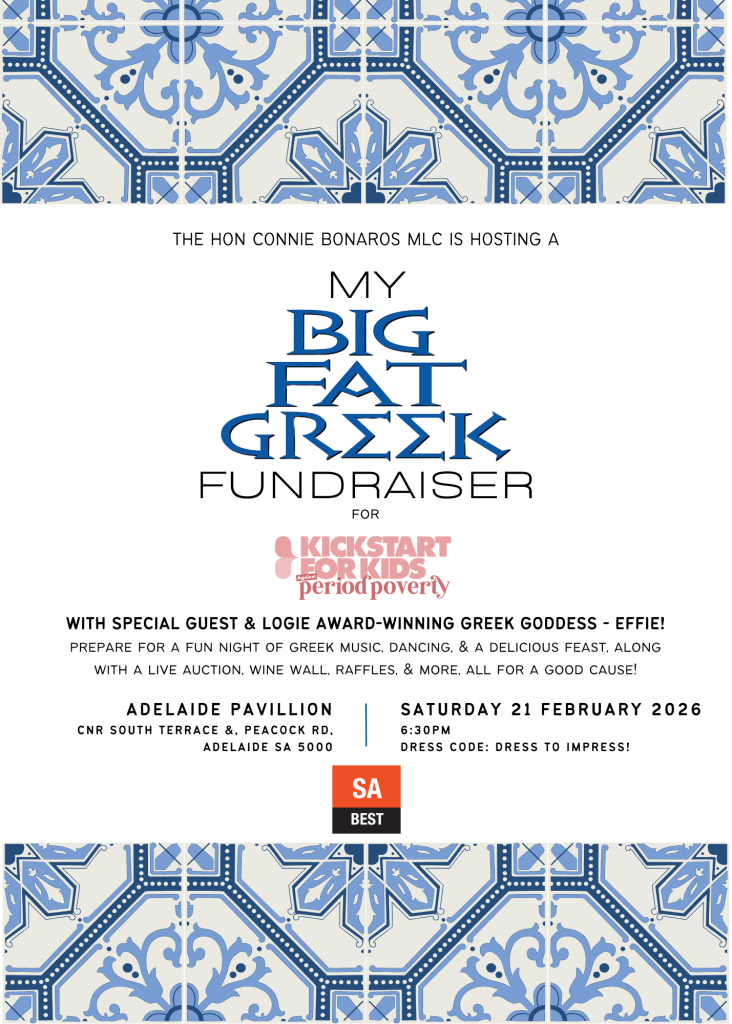 The Hon Connie Bonaros MLC is excited to announce a vibrant celebration of Greek culture as she hosts My Big Fat Greek Fundraiser at the Adelaide Pavilion in support of local charity, KickStart for Kids Against Period Poverty for which she is an ambassador.